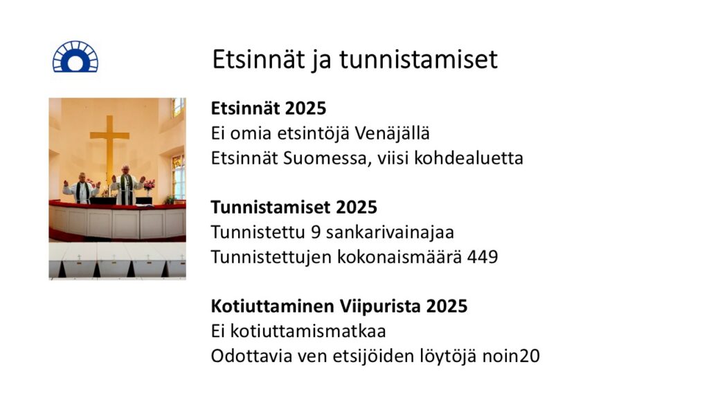 Vuoden 2026 toimintaa leimaa edelleen epävarmuus. Etsintämatkoja Venäjälle ei tehdä. Sen sijaan pyritään heti mahdollisuuden tullen kotiuttamaan tiedossa olevat venäläisten etsijöiden suomalaislöydöt.